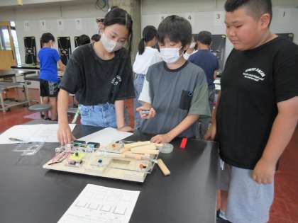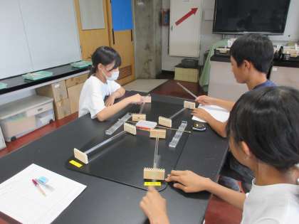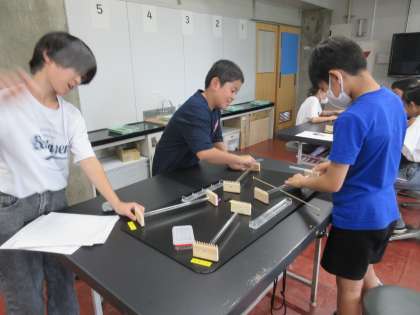 しん動に強い積み木の組み立て方を考えたり、しん動を利用して、モールを動かしたりしました。