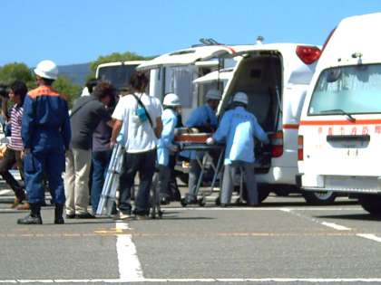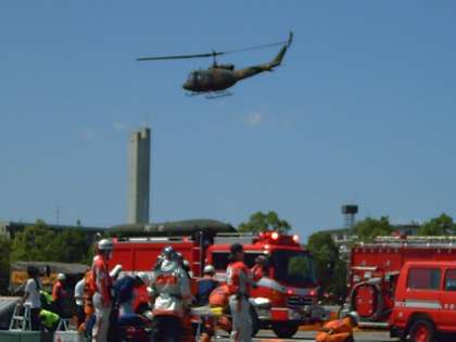 本日,京都市の防災訓練が11年ぶりに伏見の京都競馬場の駐車場で行われました。本校の4年生と3年生・3組の児童が参加しました。負傷者救助や一斉放水などの訓練が行われました。「わー!!救急車やー。」「ヘリコプターがおりてきたー。」「はしご車の上から放水しているー。」目の前で見る様々な訓練に驚き盛りだくさんでした。