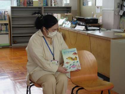図書館司書の木曽先生に、「あしたプールだ がんばるぞ」という絵本の読み聞かせをしてもらいました。