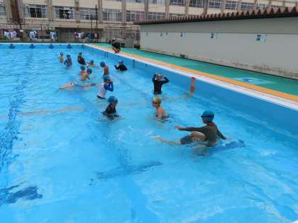 水泳学習も5時間目になりました。学習のはじめには「水中ジャンケン」や「またくぐり」を楽しみながらする中で潜ることに慣れ、水中で鼻から空気を出すことでたくさん潜れ息継ぎがスムーズにできることにつながります。学習の後半では、自分のめあてに合った場所を選んで活動しました。