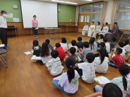 毎年3年生が、夏休みのはじめに行われる「ふれあいの夕べ」と秋の「敬老会」で披露する「納所音頭」を教えに来ていただきました。初めに納所音頭の歌詞の意味や作詞、作曲された方の思いを教えていただきました。歌詞の中に「淀小橋」や「納所小学校」などの言葉に気が付き嬉しそうでした。はじめてでしたが、「去年踊ってはったの知っている」とやる気満々で臨みました。
