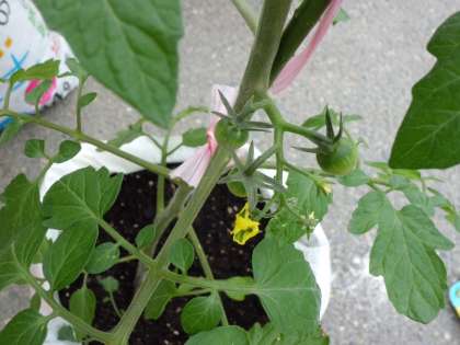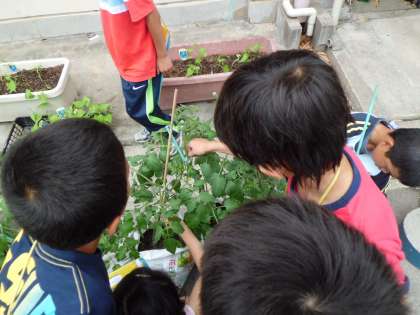 「先生〜,実ができてる〜。」「うっそ〜。」早くもミニトマトの実が…。毎日せっせと水やりを欠かさないせいか野菜の苗の成長が順調です。今日は久しぶりに観察をして,大きさや葉の形,触った感じなどを記録しました。この分では次の観察時にたくさんの野菜が見られるかも。