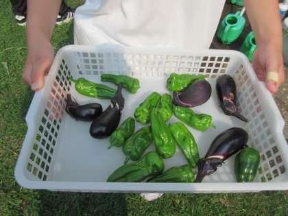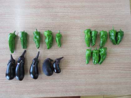 今日もひまわりの畑では、ナスとピーマンがたくさん収穫できました。