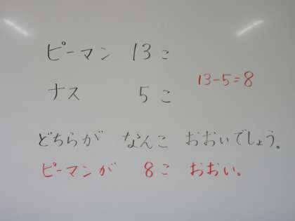 そこで、算数の学習!「ピーマンが13こ、ナスが5ことれました。どちらがなんこおおいかな?」