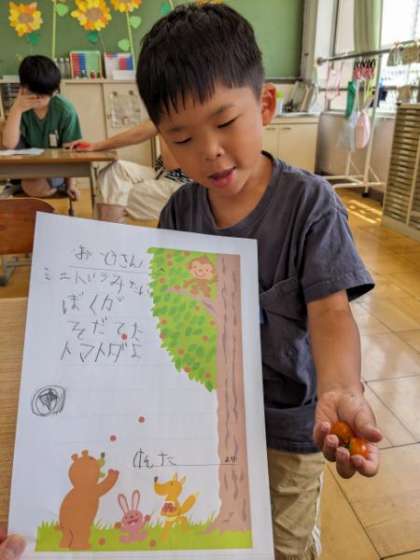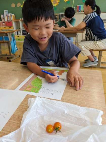 交流の生活で育てているミニトマトの実を持ち帰ることになった2年生。