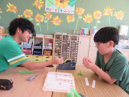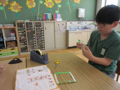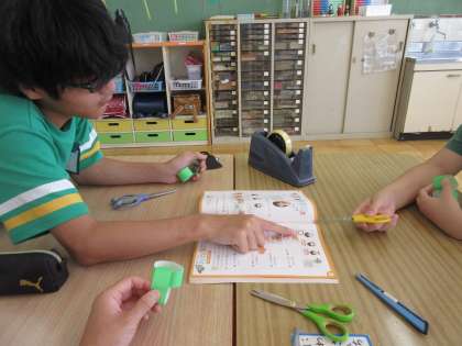同じ大きさの輪を2つ作り、教科書の手順通りに貼り合わせて切るとどうなるか、予想を立ててからやってみました。