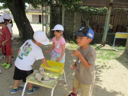 ひまわり学級の2年生が、1年生と一緒にシャボン玉あそびをしました。