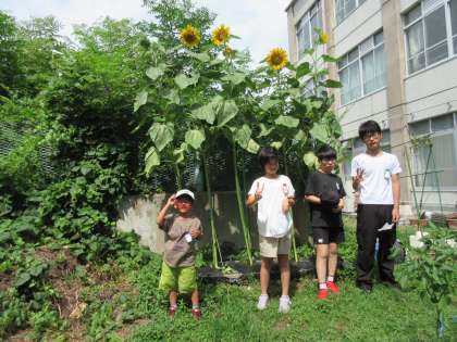 ひまわり学級のみんなでひまわりの前で記念写真。