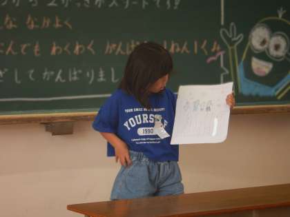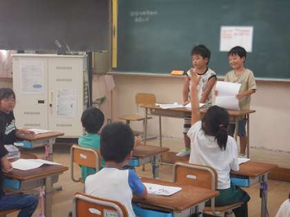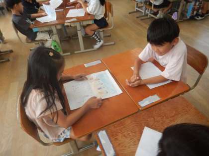 夏休みの楽しかった思い出のお話を、友達と伝え合いました。質問をしたり、感想を言ったりしました。「ぼくもそれ、した!」「いいなあ、楽しそう。」「〇〇さんと□□さん、同じところに行かはったんや。」と、盛り上がりました。