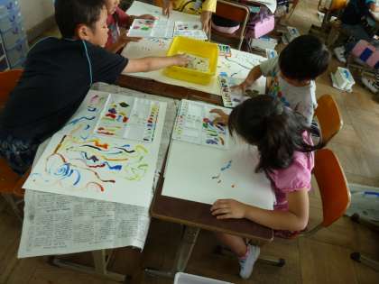 今日は初めて絵の具の使い方を学習しました。真新しい絵の具セットを大事そうに抱え,「早く使いたい〜。」と中身をさわる子どもたち。その衝動を抑えながら,まずパレットや筆洗の使い方を学習しました。そのあとは筆を使わず,指で絵の具を混ぜていろいろな線や模様を描きました。とても楽しそうでした。