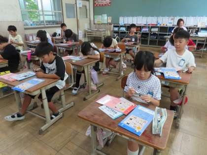 新しい漢字ドリルと計算ドリルを配布すると、これからどんな漢字を習うのか、問題を見たあと丁寧に名前を書きました。