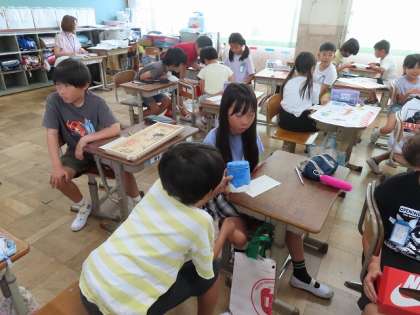 夏休みに取り組んだ自由課題を友だちに紹介しています。グループの友達の作品を見て作り方や仕組みを教え合いました。