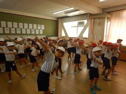 リズムに合わせて、体全体の動きを楽しんでいます。いろいろな振り付けがありますが、「楽しい!」「次はどんな動き?」と言いながら、見本の動きを真似して踊りました。