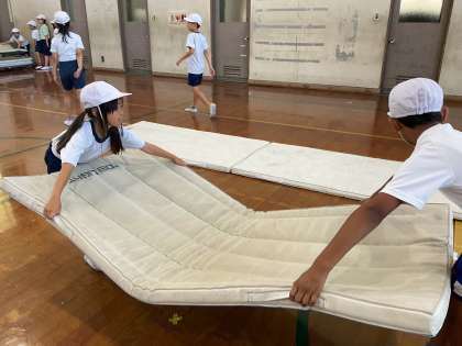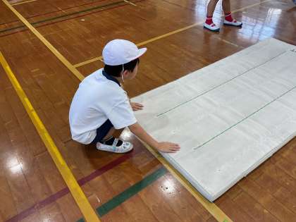 1時間目は学年で授業を行い、準備やアップの仕方を学びました。