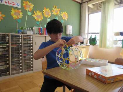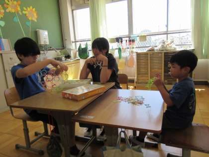 指先を使い、プチプチとつなぎ合わせて遊びます。慣れてくると素早くできるようになり、法則性を見つけてボールを作ったり、曲げてつなげてカブトムシを作ったりと、思い思いに楽しんでいました。