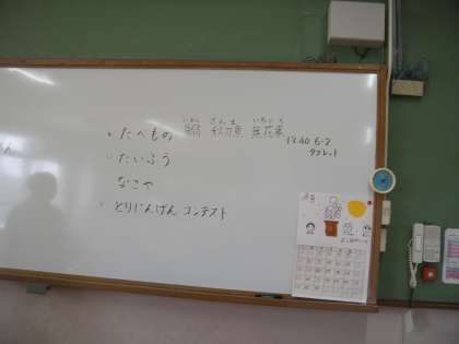 日直さんのスピーチでは,家族でクイズ大会をしたことを発表してくれました。
