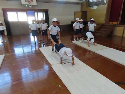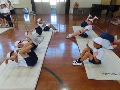 マット運動に必要な場所を動かしながら準備運動をしています。クマ歩き、うさぎ跳び、カエルの足うち、大きなゆりかご、手押し車など安全に気を付けて取り組んでいます。