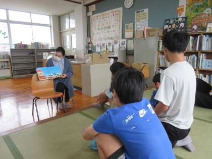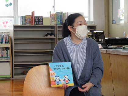 図書館司書の木曽先生に、「パンダのソフトクリームやさん」という絵本の読み聞かせをしてもらいました。