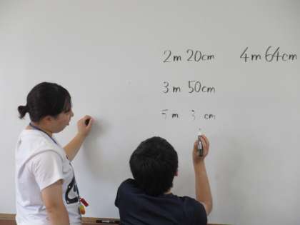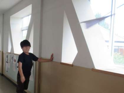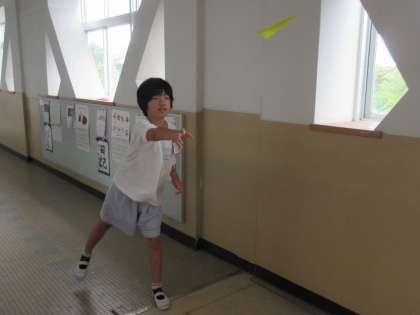 作った紙飛行機を飛ばし、飛距離を測定してホワイトボードに記録しました。