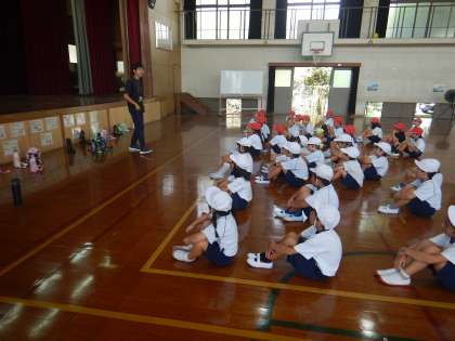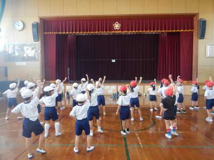 体育館でダンスをしています!振付けを覚えて、リズムに合わせて踊れるようになってきました。動きを大きくすると、ダンスがよりかっこよく見えるので、がんばっています。