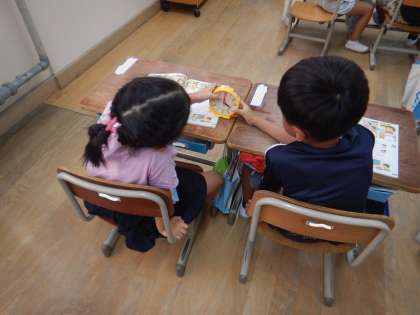 時計をよむ学習です。長い針がてっぺんのときに、短い針を見ると、「何時」かが分かることを学習しました。時計の模型を使って「〇時」を作ったり、友達のつくった「〇時」をよんだりしました。
