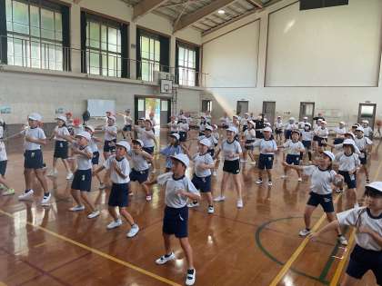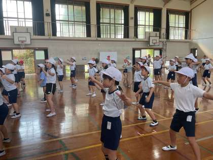 各学年の先生からのお話を聞き、始めて合同で踊ってみました。