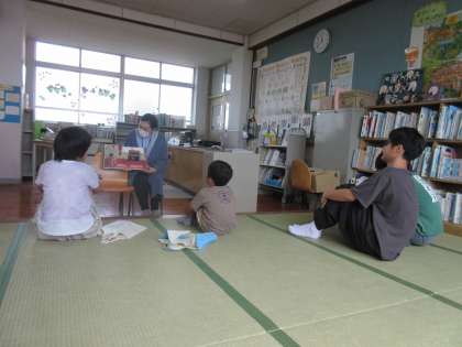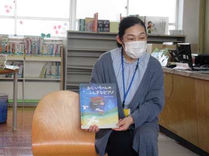 図書館司書の木曽先生に、「おじいちゃんのふしぎなピアノ」という絵本の読み聞かせをしてもらいました。