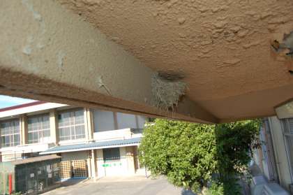 学校の正面玄関前の軒先にあるツバメの巣の中には……