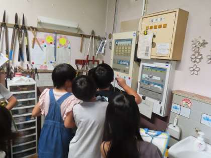 今日は、実際に校舎内の消火用設備をグループの友達と確認して回りました。初めにどこで火災が発生したかが一目でわかる設備を管理用務員室で確認した後、職員室で全校児童に素早く知らせる設備や、非常時の持ち出し袋を見せてもらいました。