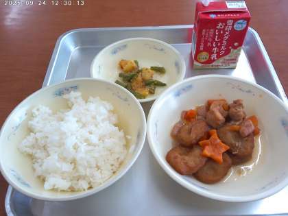 今日の給食にもハッピーキャロットやポテト,こんにゃくが入っていました。