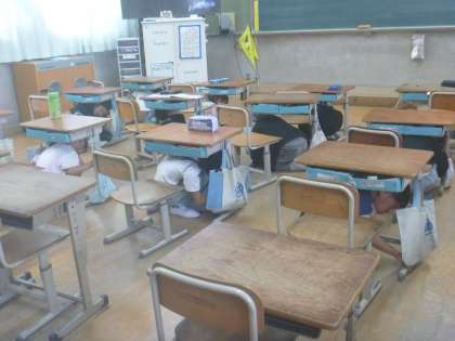 まずは…一次避難です。素早く机の下にもぐることができましたね!その後の二次避難も安全に避難することができました。