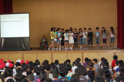 今日の集会は放送委員会の発表でした。日常の自分たちの活動内容を全校の前で発表しました。また,教職員へのアンケートの結果発表もありました。ちなみに教職員の好きな食べ物ベスト3は,1位すし 2位うどん 3位ラーメンでした。
