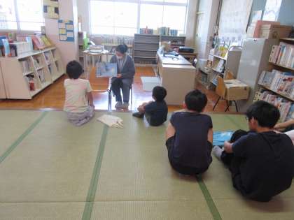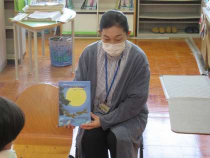 図書館司書の木曽先生に、「おつきさまのとおるみち」という絵本の読み聞かせをしてもらいました。