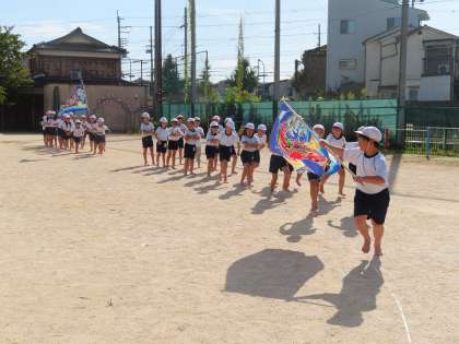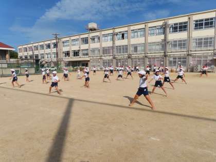 4年生と合同で、運動会に向けてソーラン節の練習を運動場でしています。