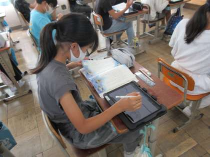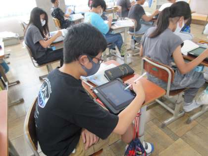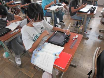 国語科では、宮沢賢治の代表作「やまなし」を学習しています。「やまなし」に出てくる「五月」と「十二月」の場面をタブレットでイラストにして表しました。