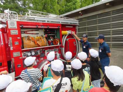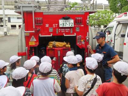 9月29日に淀消防出張所に社会科見学に行きました。始めに消防車には、どんなものが積んであるかを一つ一つ説明をしてもらいました。