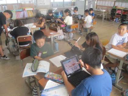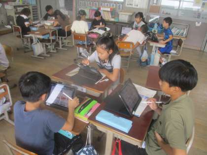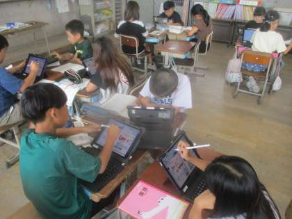 iPadを使ってパンフレットの工夫を見付け、まとめています。
