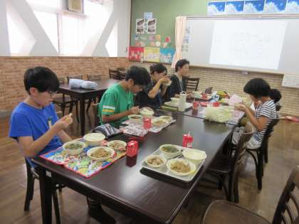授業後、ランチルームへ。いつもと雰囲気の違う場所での給食で、ウキウキしていましたよ。