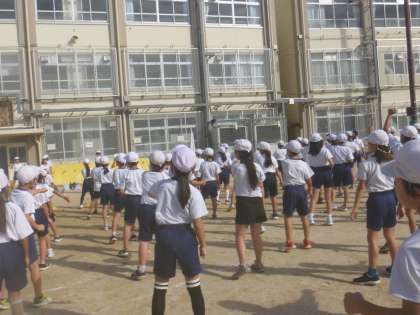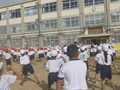 昨日は体育館でしたが、本番のように運動場でできました。運動場では、大きく動くことができましたね!