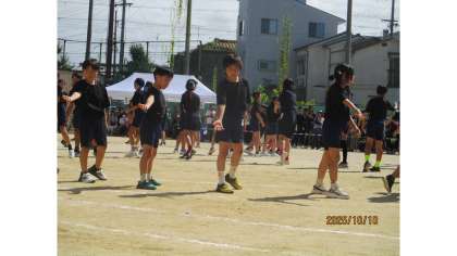 5,6年生77名で「響縁」の団体演技に望みました。今出せる自分の精一杯の力を出し切って演じていました。