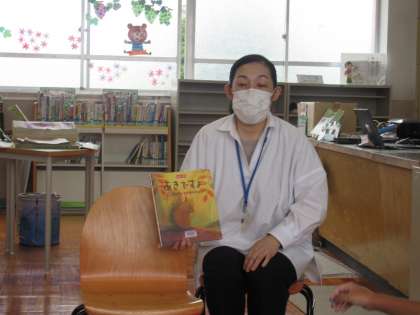図書館司書の木曽先生に、「あきですよ」という絵本の読み聞かせをしてもらいました。