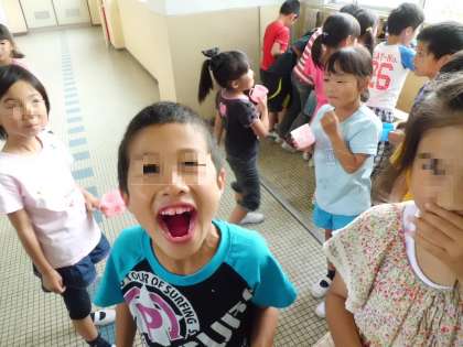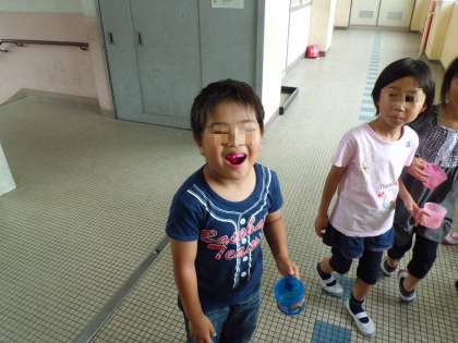 歯科衛生士さんによる歯みがき指導を受けて,歯垢染出しを行いました。思った通り歯はまっかっか。みんなもびっくり。あらためて赤いところを磨きなおしました。