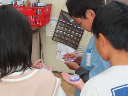 方位磁針の合わせ方を確認しています。方位磁針の針が北を指した後、方位の表示を北にあわせると4方位が一目でわかります。自分の体を使って太陽の位置と影の入りを方位で確認しました。