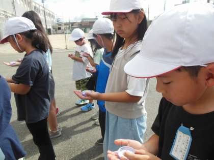 方位磁針を使って、影と太陽の方角を確認しました。