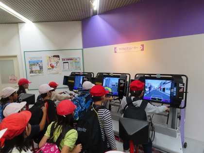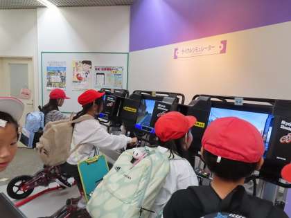 後半の体験の一番人気は、実際に自分で自転車を運転し、障害物をよけたり一時停止してたりしてクリアするコーナーでした。順番を守って上手に楽しんでいました。