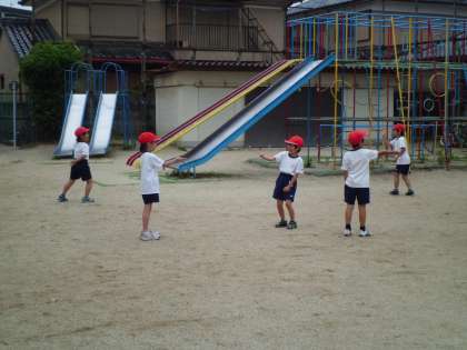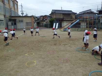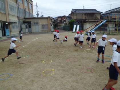 体育では水遊びと並行して「とびくらべ」の学習もしています。最初は懐かしい「グリコ」「チョコレート」「パイナップル」じゃんけん。グループごとに楽しく取り組めました。その後はケンステップを使って「四歩とびくらべ」に挑戦。自分の歩幅にケンステップを置いて,最後はフラフープに両足着地してその距離を競います。自然と助走をつけたり,歩幅を広げたりして工夫する姿が見られます。