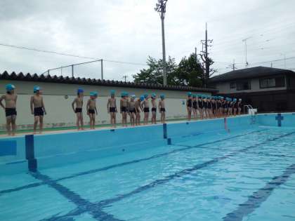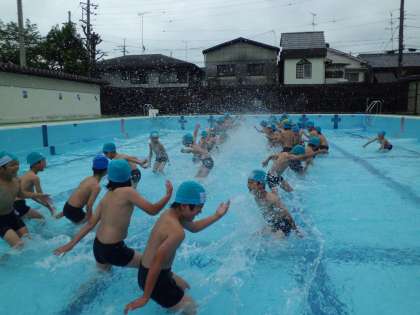 待ちに待ったこの季節,水遊びが始まりました!子どもたちは着替える前からゴーグルをつけたり水泳帽をつけたりして落ち着きませんでした。その興奮を抑え,きまりやバディを確認。最初は低水位でひざくらいの水位でしたが,まだ少し冷たく感じる水温に子どもたちは大はしゃぎでした。