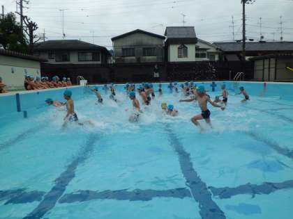 最初は低水位ならではの遊びに挑戦しました。「プールめぐり」「水かけっこ」「かけっこ」「ワニ歩き」「カニ歩き」「トンネルごっこ」…。いろいろな遊びがあります。来週からは水位も上がり,浮き技に挑戦していきます。