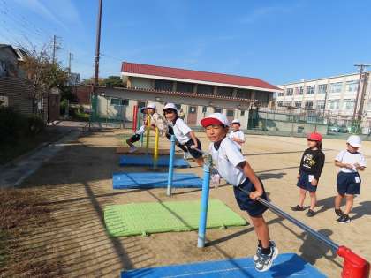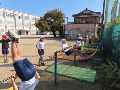 「鉄棒」3年生になって初めての鉄棒です。自分ができる技を確かめながら活動しています。準備の仕方もみんなで確認しました。