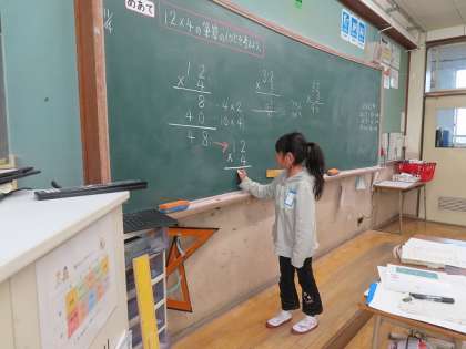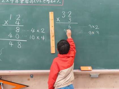 筆算の計算の意味を確認しながら考えています。2段になるときの一段目は一の位の計算、2段目は十の位のかけ算になっています。繰上がりがあると正確に足し算をすることも意識して頑張っています。
